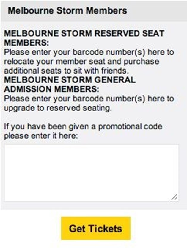 1. Visit the Melbourne Storm v St. George Illawarra Ticketek page [link], enter your member barcode(s) and click the GET TICKETS button.