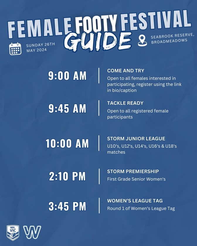 The Female Festival of Footy will be held at Seabrook Reserve on Sunday 26 May with Come 'N Try Clinics being held for anyone wanting to try rugby league as well as Tackle Ready sessions that teach safe tackling techniques.